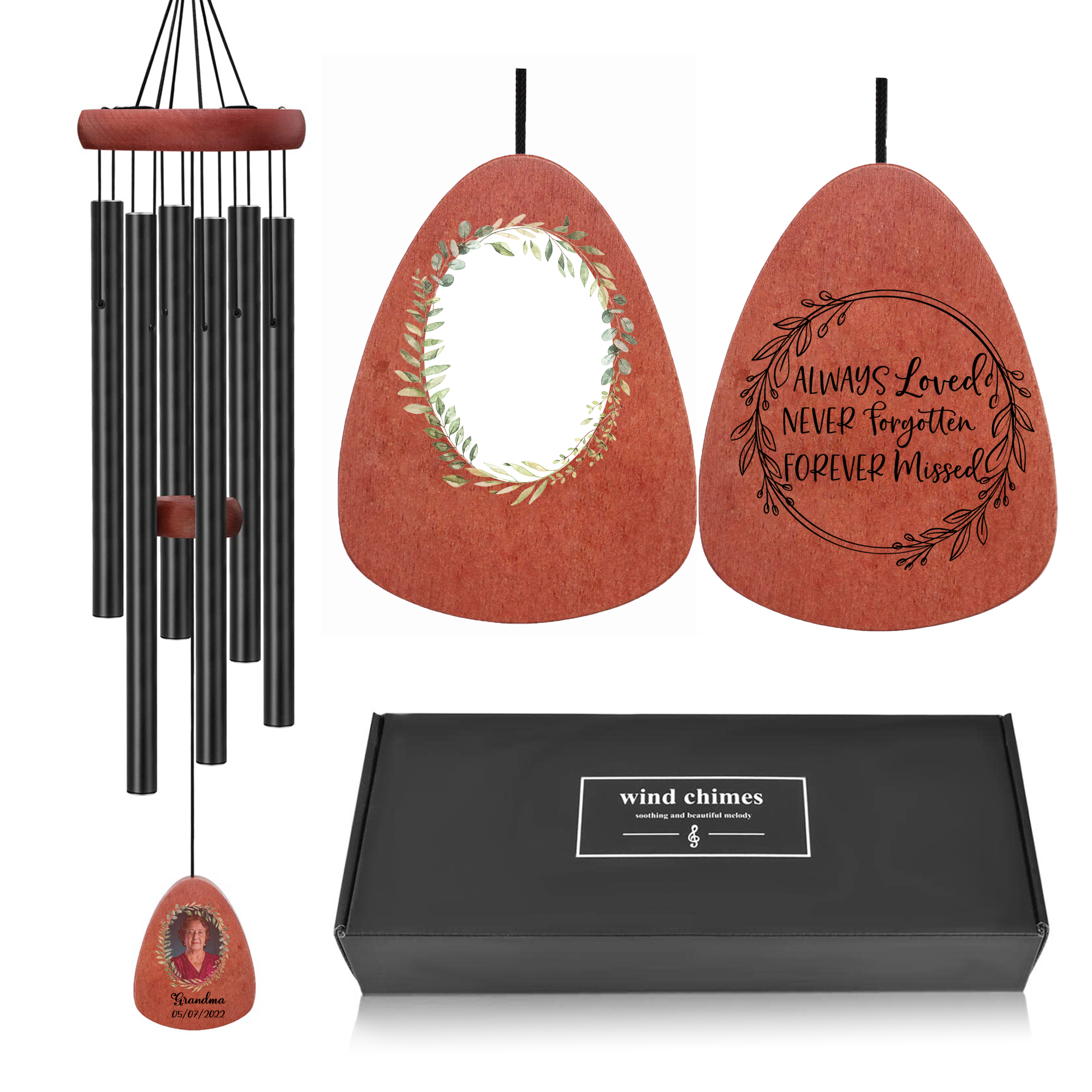 • Personalized Wind Chimes -  All tubes and pendant can be customized. Just add your loved one's name, photo, picture, memorial years, and text to create your own meaningful wind chimes.